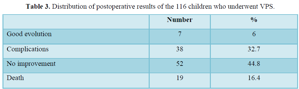 All cases of hydrocephalus treated in patients aged one month to fifteen years admitted to the unit from 2008 to 2018 have been identified. Cases of advanced hydrocephalus managed during this period were considered. The diagnosis of “advanced” hydrocephalus has been based on clinical and radiological records. These were chronic clinical intracranial hypertension, head circumference, impaired psychomotor function, the importance of ventricular dilation associated with a cerebral cortex reduced to a cortical mantle or almost disappeared. Clinical status of children, postoperative outcomes, complications, term survival and outcomes of children were the variables studied. The follow-up period was 1 to 10 years. The immediate postoperative period was considered to be the period from the first to the thirtieth day (D1- D30) postoperatively. Cases of hydranencephaly, tumoural hydrocephalus have not been included. Cases of advanced congenital hydrocephalus of incidental discovery at birth have been excluded.