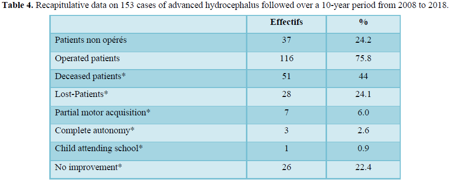 Among the 153 children, 116 (75.8%) underwent ventriculoperitoneal shunt (VPS) insertion. The shunt used were all non-adjustable and medium pressure. The motives for the 37 patients (24.2%) who did not undergo surgery were reported in Table 2. Concerning the patients who underwent surgery, the immediate postoperative course was indicated in Table 3. The post-operative complications (32.8%) observed were divided into infections, shunt migration, shunt disconnection and cranial depression in respectively 19 (16.4%), 5 (4.3%), 4 (3.4%), 10 (8.6%) cases. A shunt revision was successfully performed in all 9 cases of malfunction. Of the cases of infection observed during hospitalization, 15 (78.9%) were successfully treated and 4 patients died. Post-operative mortality was 16.4% (n=19 cases). A ten-year follow-up was carried out on the 97 children discharged from hospital. Regarding the long-term future of children, over the cumulative period of 10 years, 28 (28.9%) patients were lost to follow-up and 32 (33%) died. These deaths occurred over a period of 6 to 36 months after discharge from hospital. The overall post-operative mortality rate thus increased from 16.4% to 44% over a period of 3 years. No motor acquisition was observed in 26 (26.8%) children who remained bedridden and completely dependent. Among these children, two (2) cases of annal shunt migration were observed. A valve revision was performed for these two children. An increase in cranial dysmorphism was observed in 15 (15.5%) children. Figure 3 shows the short and long-term evolution among children undergoing surgery. A partial autonomy, partial language acquisition and the possibility of communication with their family and friends were observed in 7 (7.2%) children. Complete autonomy was observed in 4 (4.1%) children. Among these autonomous children, one child goes to school in a charity center. The recapitulative evolution of the management of these cases of advanced hydrocephalus has been reported in Table 4.