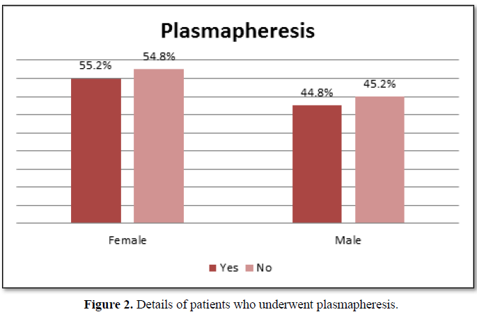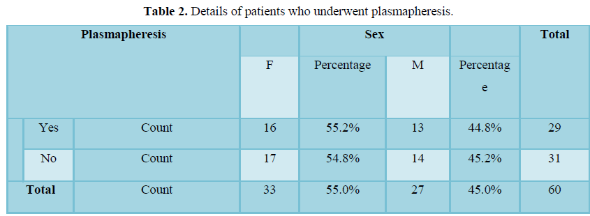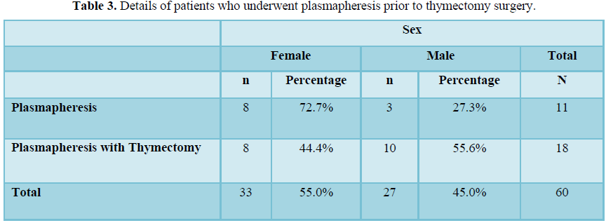 Results: A total of 60 Myasthenia Gravis patients were included in the study. Out of 60 patients 32 (53.3%) were females and 28 (46.6%) were males. The age range for males was 18 to 65 years and the females from 13 to 80. 29 patients underwent plasmapheresis. Out of these 29 patients, 11 patients underwent plasmapheresis either due to myasthenic crisis or disease worsening despite treatment and 18 patients had plasmapheresis prior to thymectomy surgery, however, these patients were not included in study.