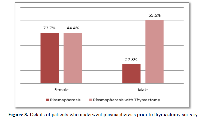 29 patients underwent plasmapheresis as showed in Table 2 and Figure 2. Out of these 29 patients, 11 patients underwent plasmapheresis either due to myasthenic crisis or disease worsening despite treatment and 18 patients had plasmapheresis prior to thymectomy surgery as shown in Table 3 and Figure 3, however, these patients were not included in study. A total 80 sessions of plasmapheresis were done in all these 3 conditions i.e. myasthenic crisis, disease worsening or before thymectomy surgery.