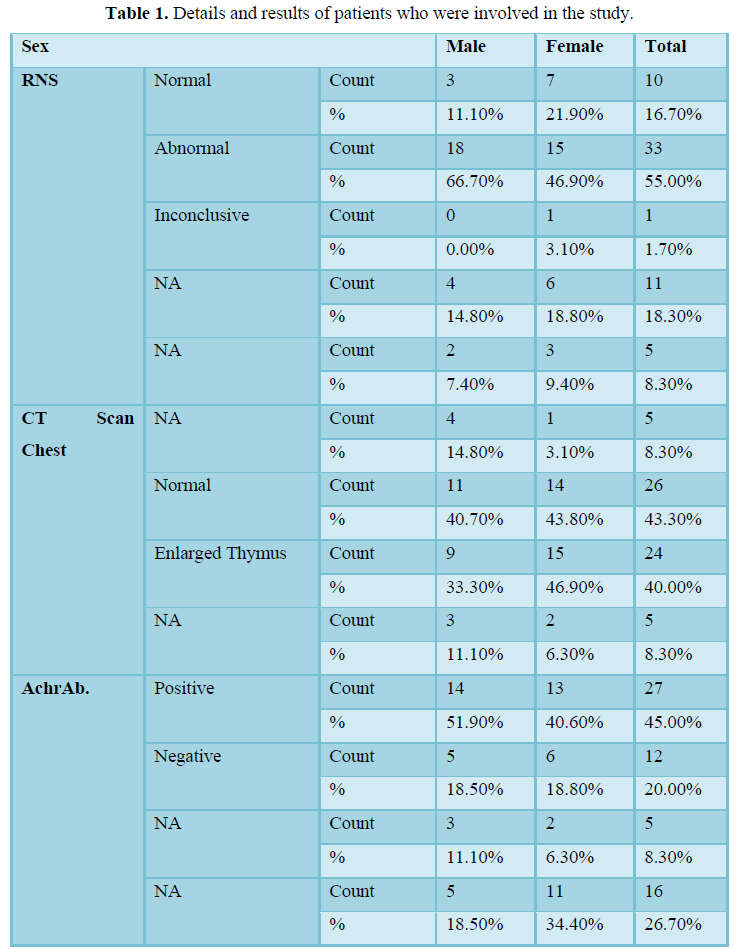 A total of 60 Myasthenia Gravis patients were included in the study. Out of 60 patients, 32 (53.3 %) were females and 28 (46.6%) were males. The age range for males was 18 to 65 years and the females from 13 to 80 33 patients had abnormal repetitive nerve stimulation (RNS) test. 10 patients had normal RNS, of 1 patient RNS was inconclusive and for 17 patients RNS was not available. Repetitive nerve stimulation (RNS) is a variant of the nerve conduction study where electrical stimulation is delivered to a motor nerve repeatedly several times per second. Repetitive nerve stimulation is used to diagnose neuromuscular junction (NMJ) disorders, the most common of which is myasthenia gravis. A decremental response (a smaller and smaller muscle response with each repetitive stimulus) is abnormal and indicates neuromuscular junction (NMJ) dysfunction.