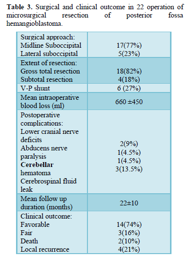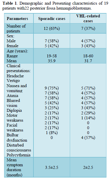 Patients and Methods: This is an analytical retrospective study enrolled 19 patients (11 males and 8 females; with mean age of 35.9 years in sporadic cases and 31.7 years in VHL related cases) with posterior fossa hemangioblastomas who underwent microsurgical resection of 22 lesions through a midline or lateral suboccipital approach.