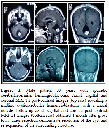 Patients’ demographics: There were 11 males (58%) and 8 females (42 %) with age at time of surgery ranging from 18-60 years with mean age of 35.9 years in sporadic cases and 31.7years in VHL related cases. These cases were 12 cases (63%) of sporadic posterior fossa hemangioblastoma in whom 7 were males (58% of sporadic, 36% of total) and 5 were females (42% of sporadic, 26% of total). The other 7 cases (37%) had clinical confirmation of VHL disease. They were series of 7 cases (4 males and 3 females), from the same Bedouin Sinai family, who were managed in departments of neurosurgery, urology and ophthalmology during the previous 2 decades with age at surgery (18,25,26,28,30,35,60) years. 3 patients harbored retinal hemangioblastomas, 1 patient harbored pancreatic carcinoma, 1 patient had spinal hemangioblastoma, and 3 had multiple cerebellar hemangioblastoma.