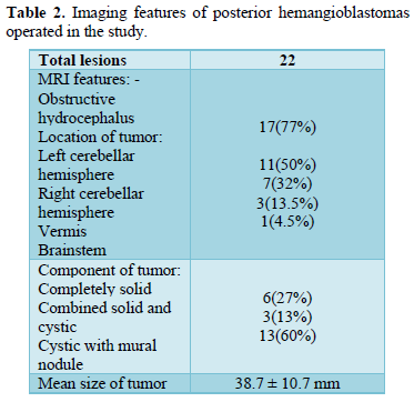Purpose: The purpose is to analyze the clinical and imaging characteristics of posterior fossa hemangioblastomas, rates of surgical excision and clinical outcome.