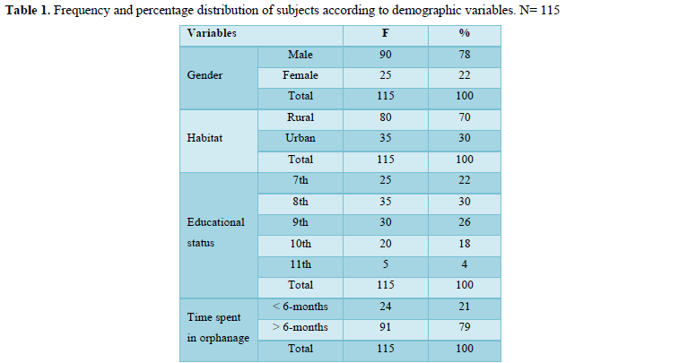 Table 1 represents the distribution of study subjects according to their socio-demographic variables. The data obtained are described in terms of gender, habitat, educational status, type of orphan, and time spent in orphanage.