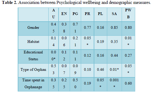 From Table 2, it is evident that Habitat was significantly associated with psychological wellbeing and Positive relation with others. Educational status was found to be significantly associated with Autonomy dimension of psychological wellbeing. Type of orphan had significant association with psychological wellbeing and one of its components that is Self-acceptance. While Time spent in orphanage had significant association with 2 dimensions of psychological wellbeing viz Purpose in life and Self-acceptance.