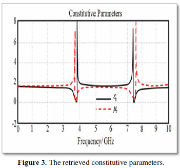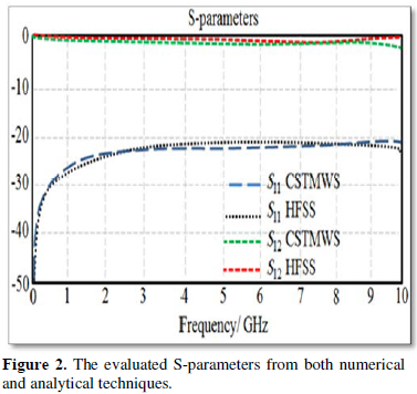 The unit cell structure is characterized in terms of S-parameters to retrieve the constitutive parameters in terms of relative permittivity (εr) and relative permeability (μr). As seen in Figure 2, the S-parameters are evaluated from CST MWS, than, they are compared the HFSS results. This comparison is performed to validate the obtained results from the CST MWS software package.