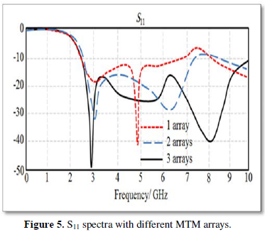 In this section, a numerical study based on Computer Simulation Technology Microwave Studio (CST MWS) formulations [11] is invoked to optimize the antenna performance and the MTM characterizations. In the first, the antenna structure is optimized to provide the maximum antenna bandwidth match with maximum gain. Next, the MTM is designed and characterized numerically in terms of S11 spectrum. Then, the antenna structure is integrated to the MTM to realize the obtained enhancements on the antenna performance.