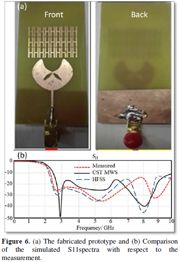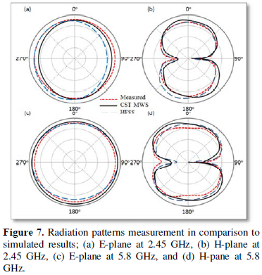 The proposed antenna performance is validated numerically before realize the prototype fabrication and perform the experimental measurements. Then the proposed antenna is fabricated using chemical etching processing. The fabricated antenna is shown in Figure 6a with MTM structure. The numerical validation is conducted with HFSS software package [15] to evaluate the S11 spectrum and the radiation patterns at 2.45 GHz and 5.8 GHz. As seen in Figure 6b, the obtained results from the CST MWS software package agree excellently with those obtained from the HFSS simulations. It is found that the proposed antenna shows excellent matching, |S11|<-10 dB, for the entire band from 2.38 GHz up to 10 GHz. When the experimental measurements are conducted with a Vector Network Analyzer (VNA) of Vector star MS4642A Series, the antenna shows excellent matching with entire band from 2.4 GHz up to 10 GHz.
