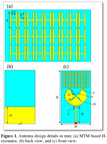 The patch layer is mounted on an FR-4 substrate of 30 mm × 60 mm with 1 mm thickness. The partial ground plane is introduced to obtain the maximum bandwidth coupling over the entire band of interest. Therefore, the antenna bandwidth is found to cover the frequencies from 2.4 GHz up to10 GHz with maximum gain of 5.9 dBi. However, the antenna radiation patterns would be mostly scattered toward different directions that limits the antenna use in portable and compact handsets devices. In Figure 1, the antenna design based on MTM structure is presented.