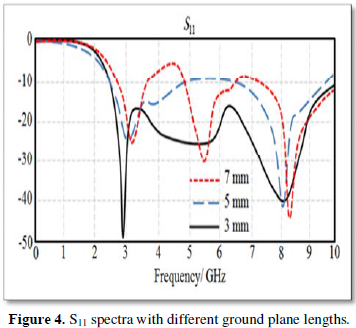 The antenna structure is based on a partial ground plane to obtain significant bandwidth enhancements. In Figure 4, the effect of the ground plane length on the matching impedance is realized with the S11 spectra. It is found that the antenna shows the best matching bandwidth at 7 mm from the antenna centre. This is due to the effects of fringing from the ground plane edges with respect to the patch edges.