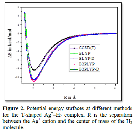 Sen et al. [15] carried out further investigation on the interaction between the metal cations and H2 molecule of the heavy cation-dihydrogen (M+–H2, where M=Mg, Ca, and Ag) vdW complexes using the same dispersion corrected and uncorrected hybrid density functional and CCSD(T) methods in conjunction with the correlation consistent triple-ζ quality basis sets for storage of H2 molecule. They computed the molecular properties, potential energy surfaces (Figure 2), stability, binding energy and well-depth of the metal cation-dihydrogen (M+–H2, M=Mg, Ca and Ag) complexes in the gas phase. The authors claimed that the results obtained by the dispersion corrected hybrid density functional B2PLYP-D method among all other methods studied here, agree very well with the earlier experimental and theoretical results wherever available. They also estimated the different components of the interaction energy using SAPT analysis to get physical insight into the interaction energy. The authors concluded that among the three complexes, only Ag+–H2 is the most stable complex and it accumulates more H2 molecules as the interaction between the metal cation Ag+ and the H2 molecule is the greatest. Thus the Ag+–H2 system stores more H2 molecule because the storage of molecular hydrogen depends on the interaction between metal cation (here Ag+) and H2 molecule. The Ca+–H2 complex is the least stable as the interaction between Ca+ and H2 is the lowest and its dissociation energy is the lowest among the complexes. So, the Ca+–H2 complex cannot store H2 molecule significantly as the binding energy of it is the lowest among all other vdW complexes.