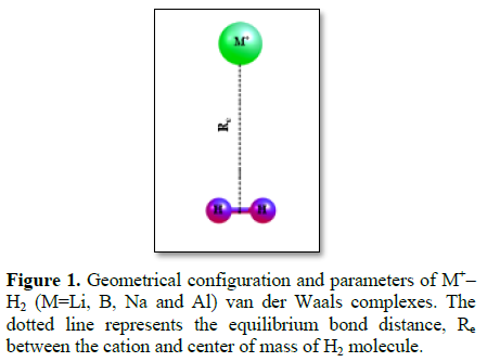Recently, Pakhira et al. [8] studied the light cation–dihydrogen (M+–H2, where M=Li, Na, B and Al) van der Waals (vdW) complexes (as shown in Figure 1) in detail using dispersion corrected double hybrid and gradient-corrected density functional (DFT-D) [8-14] methods in conjunction with correlation consistent valence triple-ζ basis set. They investigated the electronic structures, bond distance (Re), potential energy curves (PECs) and dissociation energy (Do) which agree very well with the experimental and theoretical values wherever available. The dissociation energies of Li+–H2, B+–H2, Na+–H2 and Al+–H2 van der Waals complexes calculated from the potential energy curves at mPW2PLYP-D/cc-pVTZ level are 4.83, 3.68, 2.42 and 1.25 kcal/mol, respectively, at a distances of 1.95, 2.25, 2.40 and 2.95 Å and these results were well harmonized with the previous experiment. Their DFT-D calculations reveal that the Li+–H2 complex is most stable among the four cation-H2 complexes, because the depth of the potential well and dissociation energy of the complex are relatively greater than that of the others. Among all these complexes, Al+–H2 complex is comparatively less stable, as their dissociation energy as well as depth of the potential well are smaller compared to others complexes. They also computed the dissociation energy of the above mentioned vdW complexes by CCSD(T) methods and compared the values with DFT-D results. The authors applied the symmetry-adapted perturbation theory (SAPT) to quantify the nature of interactions as well as compute the individual components of the interactions energy such as electrostatic, polarization, dispersion and exchange. The SAPT results showed that the contribution of dispersion and induction were significant, although electrostatic dominates. They also computed the NBO atomic charges at mPW2PLYP-D/cc-pVTZ level of theory of the M+–H2 complexes and the total electron density map for all the complexes were plotted by them.