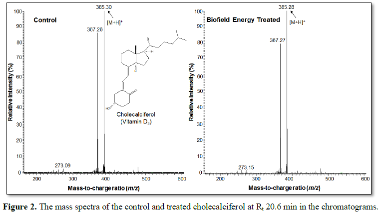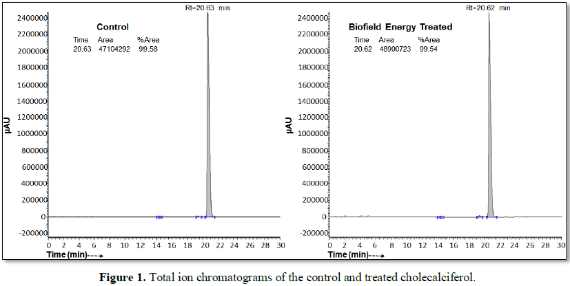 spectrometry (LC-MS) chromatograms of both the cholecalciferol samples showed a