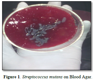Primarily dental samples were spread on sterile nutrient broth and nutrient agar (Hi Media) anaerobically at 37°C for 24 h. Sub-culture was done repeatedly at 37°C for 24-36 h anaerobically on the Blood agar and Brian heart infusion until pure colony was obtained.
