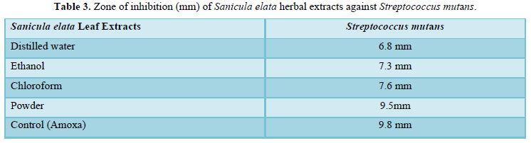 10 dental samples were taken from Turinesh Beijing General Hospital to isolate dental decay bacteria. The primary culture was done by culturing bacteria on nutrient broth and agar. Sub culturing was done on selective media blood agar until pure colony was obtained. Various biochemical tests were performed to identify Streptococcus mutans. Antibacterial activity of Sanicula elata was evaluated by extracting crudes from plants leaf using organic solvents (chloroform, ethanol and distilled water). Antibacterial assay was performed on Muller Hinton Agar using well-diffusion method.