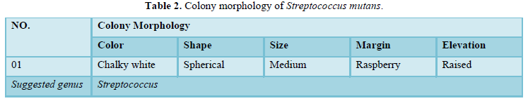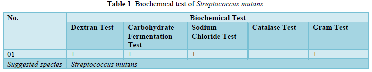 In dextran production tests, the occurrences of flocculation in all three tubes and turbidity in the alcohols have indicated that formation of dextran. The bacteria also grow on high concentration of 10% sucrose and ferment it to lactic acid, and become lower pH up to 4.5. It also grows on high salt concentration at 4% Sodium chloride. High turbidity which indicates high bacterial growth was observed in nutrient broth. During catalase test bacteria didn’t indicate foam. Hence, it is catalase negative. Gram tests also showed that purple color which indicates gram positive. The study outcome is similar with Essam [7] and Nada [4]. Then, we decide the bacterium (Table 2) is streptococcus mutans.