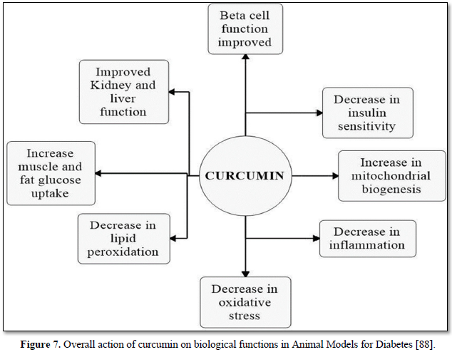 A careful examination was done on the animal models and during experimentation different doses of curcumin at different time interval were administered for 8 weeks. The common dose was 100-300 mg/kg in a day. Animal models were STZ induced genetic models related to diabetes and diet induced; thus, curcumin bioavailability could also be improved by drug delivery systems using cyclodextrins, nanoparticles, micro emulsions, liposomes to improve the action of curcumin and its absorption. The overall action of curcumin for glucose metabolism is in Figure 7.
