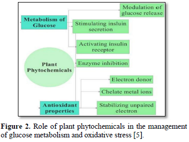 Traditional medicine is an alternative to the conventional medicine and has been widely used all over the world from ancient times. Traditional medicine includes herbal medicine, also known by the names of botanical medicine or phytomedicine. Before the conventional medicine, herbal medicines were already in use. Herbal medicine has no harmful effects if it is used with conventional medicine [3]. Almost 1200 plants have been known to have antidiabetic properties [11]. Agents having antidiabetic potential, especially derived from plants or natural sources have fewer or no side effects. They have no toxicity, having an effective role in diabetes and they are less expensive. They can be affordable and easily available [1]. People from rural or far areas have more knowledge of traditional medicine with a great diversity of plants [12]. Different polyphenols derived from different plants have impact on metabolism of glucose in various ways which include stimulating the secretion of insulin from β-cells of pancreas, help to inhibit the carbohydrate breakdown, increase in the absorption of glucose in intestine, receptors activation of insulin. Thus, increasing uptake of glucose in insulin sensitive tissues. Figure 2 explains how phytochemicals manage glucose metabolism and oxidative stress [5].