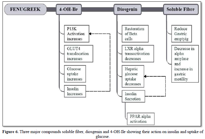 Fenugreek has its own importance in term of medical for diabetes and food purposes. Saponin compound present in fenugreek is responsible for the increase in antioxidant enzymes and in the reduction of lipid peroxidation. If there is decrease in the reduction of insulin then inflammation will be reduced and this will not inhibit the insulin action and will ultimately increase the uptake of glucose by the cells and will decrease the plasma glucose level [70]. Figure 6 is showing the mechanism of three main components of Fenugreek.