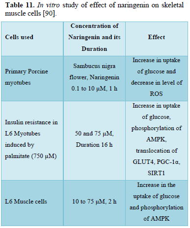 In an experiment, muscle cells were treated with naringenin which promoted the uptake of glucose followed by the activation and phosphorylation of AMPK. The in vitro study on effects of naringenin on skeletal muscles is explained in Table 11.