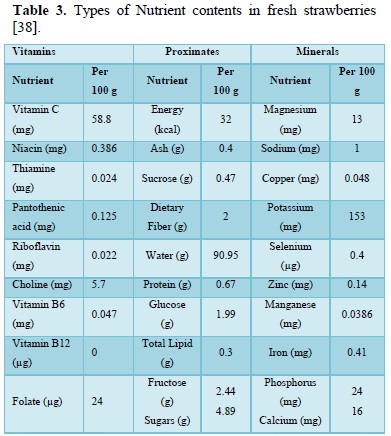 Phytochemicals are of hundred types in which two-third parts are flavonoids and one third are phenolic acids [36]. Strawberry phytochemicals include flavonoids which contains a high amount of anthocyanin and ellagic acid which is the important compound in strawberry [37]. A brief study about nutrient contents in fresh strawberries is given in Table 3 [38].