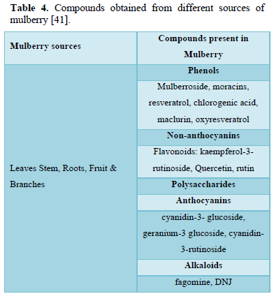 Morus alba is one of the common specie of Moraceae family. It is also known as white mulberry. It has white or purple color and has a sweet taste. Leaves, root, stem, or fruit are used for many purposes in which important one is diabetes. Chinese have been using mulberry leaves widely to treat diabetes. Mulberry fruit, leaves, stem, and root contain benzo furans, alkaloids, vitamins, minerals, steroids, amino acids, prenylated flavonoids and triterpenes as a major bio-active-components that are responsible for hypoglycemic activity by acting on the pancreas. Some of the components obtained from mulberry are given in Table 4 [41].