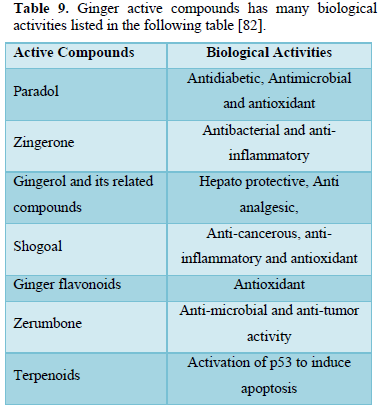 Ginger is grown in tropical regions due to its edible rhizome. It is used for many medical purposes like anti-thrombotic, anti-arthritic, anti-inflammatory and against nausea [80]. It also helps to fight against cancer, hypertension and obesity. It is also used to treat kidney, neural system, and diabetic liver and eye complications. Many experiments were performed in which extract of different doses from ginger was administered which significantly decrease glucose level in blood of diabetic patients [81]. Potentially bioactive compounds present in ginger are gingerols and shogaols, and volatile oils present in them are sesquiterpenes, monoterpenes and β- bisabolene and (-)-zingiberene [80]. The other compounds of ginger with their biological activities are explained in Table 9.