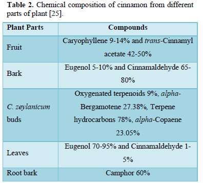 Effect of cinnamon was also studied on 60 patients. Patients were kept under observation in which 1, 3 and 6g of cinnamon dose for 40 days was given to them. The results showed that cinnamon can also lower glucose level and other diabetic complications. Inactive insulin receptors can be activated by polyphenols and chromium. These substances are present naturally in cinnamon. These substances improve insulin signaling pathway. Insulin receptors are phosphorylated and glucose level is regulated [23]. Some of the important compounds reported in cinnamon are caryophyllene oxide, L-bornyl acetate, α-cubebene, terpenoline, eugenol, α-terpineol, trans-cinnamaldehye and α-thugene. These phytochemicals from different parts of cinnamon with their compositions are mentioned in Table 2. The antidiabetic potential of cinnamon is shown in Figure 3.