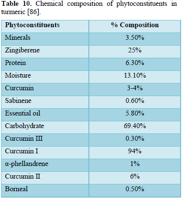 Turmeric is in daily practice for medicinal purposes. It is grown in tropical regions related to the family Scitaminae. Due to its therapeutic potential, it is used for ailment of many diseases such as diabetes, inflammation, obesity, to reduce the risk of cancer and for effective immunity [83]. Turmeric consists of curcumin 2-8%. This helps to improve the hyperglycemia and metabolic problems. Curcumin is responsible for the stimulation of beta cell function that increased the secretion of postprandial insulin level and this effect is due to the ingestion of 6 g of turmeric. One experiment was performed by using turmeric and curcumin present in it decreased the glucose level in plasma by decreasing the gluconeogenesis and increasing glycogen synthesis in liver [84]. Rhizome powder obtained from turmeric plant and ingestion of 6 g of its dose caused an increase in insulin secretion in which curcumin decreased the peroxidation of lipid by increasing the process of antioxidant enzymes such as glutathione S transferase, glutathione peroxidase. Human pancreatic amylase inhibition by the alcoholic extract of curcuminoids reduced the hydrolysis of starch leading to mitigation of glucose level [83]. The phytoconstituents of turmeric and their chemical composition in percentage is given in Table 10.