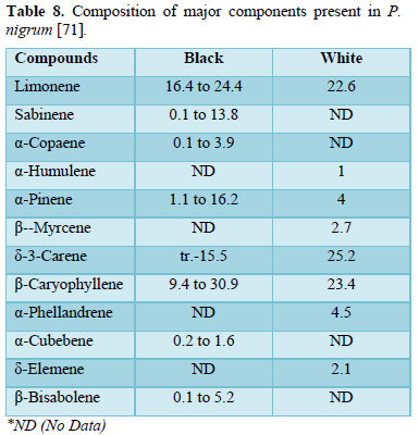 Black pepper has been one of the most widely used spices known to be the “king of spices” in the world. Using in food, it is the major source of dietary polyphenols helps in controlling the Diabetes mellitus and other diseases due to presence of anti-glycation properties in it [70]. Compounds from black pepper are already in use for pharmacological purposes. Percentages of major components of Piper nigrum are given in Table 8. It contains the major alkaloid compound named “piperine”. This component has many applications viz antifungal, antibacterial, anti-inflammation, sore throat, analgesic, anti-cancerous, antidepressant, insecticidal, and it also has application for hyperglycemia regulation [71].