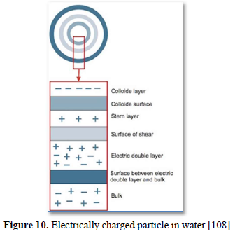 Particles in water are electrically charged as shown in Figure 10 [108]. The area nearest to the particle is divided into two layers: (a) the first layer is the closest to the electrically charged particle and in which counter ions gather to create the stern layer and (b) the next layer is composed of both counter-ions and co-ions, but with a surplus of counter-ions. The bulk (the surrounding water) has an equal distribution of counter-ions and co-ions [109-111]. In coagulation, the two layers around the particle cause it to be stable in the water. When the conditions within the water are changed by a change in pH or conductivity, the number of ions in the water changes and affects the amounts of ions in the two layers, thereby affecting the stability of the particles and force them to settle as shown in Figure 11-top [108]. In flocculation, electrically charged particles precipitate by flocculation polymers with charged sites. By using a polymer with the opposite charge to that of the particles to be flocculated, the particles will bound to the polymer making larger particles that cannot stay suspended as shown in Figure 11-bottom [108]. When particles are precipitated from the solution (Figure 12), further filtration treatment is necessary to obtain the desired water quality [112]. Figure 13 shows a system having the processes of coagulation, flocculation, and sedimentation [113].