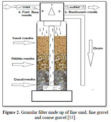 Granular filtration is a process where water or wastewater flows through granular material while suspended solids (sand, clay, organic particles and iron and aluminum flocs) and pathogenic microorganisms (bacteria, algae and protozoa) are removed. The granular media are made of sand, fine and course gravels, pebbles, synthetic polymers, diatomaceous earth, coal, sponge, charcoal, and cotton. Figures 2 and 3 show 2 types of granular filters made from sand and gravels [55,56].