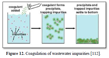 Jekel and Heinzmann [114] reported that coagulation and flocculation can be used for removal of dissolved solids and suspended particles including pathogens (Giardia and Cryptosporidium, a parasite that cases diarrhea), virus, arsenic, phosphorus, and fluoride. They showed that the efficiency of the coagulation-flocculation process was dependent on the type of coagulant, coagulant dosage, coagulant feed concentration, type and dosage of chemical additives, sequence of chemical addition, pH and time lag between dosing points, intensity and duration of mixing, velocity gradients applied during flocculation stage, flocculator retention time, type of stirring device and flocculator geometry.