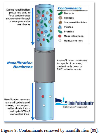 Nanofiltration membrane has a pore size of 0.001 μm and can remove most organic molecules, viruses, cysts, bacteria, a wide range of salts and humic materials as shown in Figure 8 [88]. Pushing water through smaller membrane pores requires higher operation pressure of 600-1000 kPa [89]. Nanofiltration is used to remove dissolved contaminants and viruses from surface and ground water [90,91] and various wastewaters [88]. It provides high rejection of multivalent ions such as calcium and low rejection of monovalent ions such as chloride. The nanofiltration membrane rejects various salts in proportion to their molecular size, the order of rejection is Na2SO4>CaCl2>NaCl [89-91].