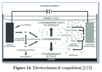 Sahu et al. [137] reviewed the mechanism, affecting factors, process, and application of the electrocoagulation process. They found the electrocoagulation process to be widely accepted over other physicochemical processes due to its ability to treat large volume and its low cost. The electrocoagulation process was able to remove pollutants such as pesticides, radionuclides and harmful microorganisms.