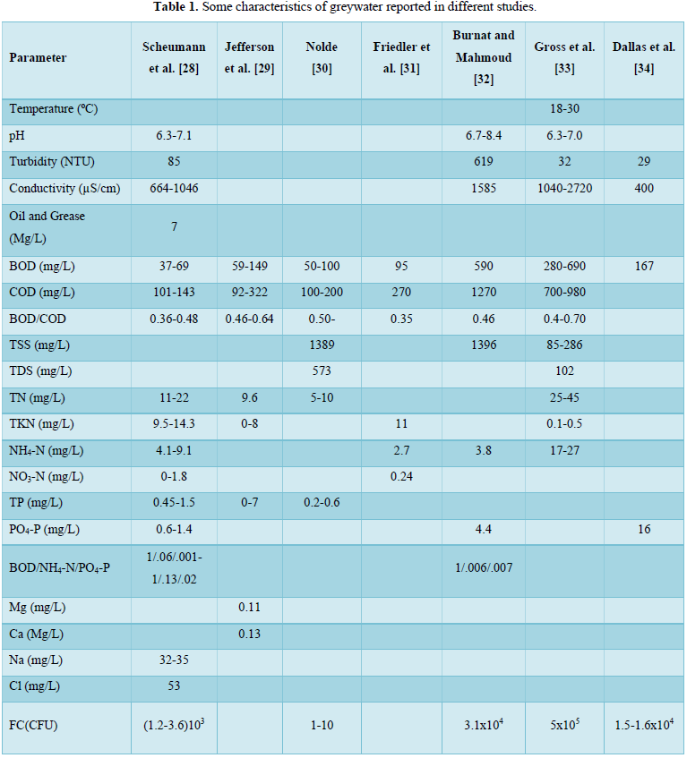 Grey water contains fewer pathogens than domestic wastewater and is generally easier to treat and reuse safely for toilet flushing, landscape, crop irrigation and other non-potable uses [9,22-26,27]. In our previous work [2], we examined the available biological treatment technologies for greywater treatment. In this study, the available physical and chemical greywater treatment technologies were reviewed. However, when selecting a physical or a chemical treatment process for greywater, the characteristics of greywater must be taken into consideration. These include pH, electric conductivity, oil and grease, surfactants, suspended solids, BOD, COD, nutrients, and microbes. Some characteristics of greywater reported in different studies are shown in Table 1 [28-34]. Microbial contaminants reported in various greywater studies are shown in Table 2 [12,35-48].