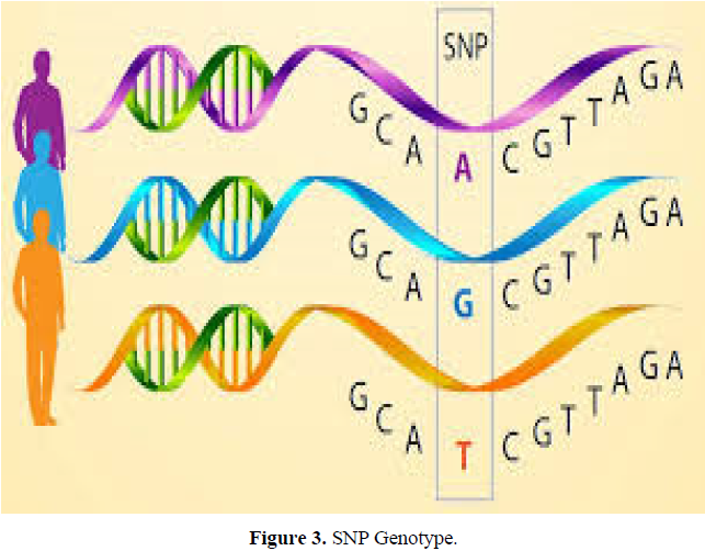A nucleotide sequence consist of four nucleotide (known symbol is A,T,G,C) and usually these letters make sentences ( known as genetic code) instruct living cell in our body to work .So in Single Nucleotide Polymorphism (SNP) make a change in genetic code i.e. make a substation of a single nucleotide that occurs at a specific position in the genome, which is very common up to 0.5% variation among normal population has shown in 1000 genome project. For example, at a specific base position in the human genome, the C nucleotide may appear in most individuals, but in a minority of individuals, the position is occupied by an A. This means that there is a SNP at this specific position, and the two possible nucleotide variations – C or A – are said to be the alleles for this specific position SNPs pinpoint differences in our susceptibility to a wide range of diseases (e.g. sickle-cell anemia, β-thalassemia and cystic fibrosis result from SNPs). The severity of illness and the way the body responds to treatments are also manifestations of genetic variations. For example, a single-base mutation in the APOE (Apo lipoprotein E) gene is associated with a lower risk for Alzheimer's disease (Figure 3).