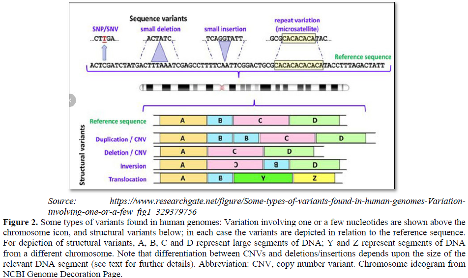 Let’s start with the famous quote by Charles Darwin: “It is not the strongest of the species that survives, nor the most intelligent, but the one who is most adaptable to change.” Same statement was made about 200 years before Ultimately present Genomic science (post-human genome project era) has accepted him as a father of our Genomic Science. Present Genomic Science has defined our Genome – consist of complete set of DNAs, including all of its genes. Each genome contains all of the information needed to build and maintain that organism. In humans, a copy of the entire genome—more than 3 billion DNA base pairs—is contained in all cells that have a nucleus. So, genetic variation is caused by variation in the order of bases in the nucleotides in genes. New technology now allows scientists to directly sequence DNA which has identified even more genetic variation than was previously detected by protein electrophoresis. These differences are called genomic variants (Figure 5).