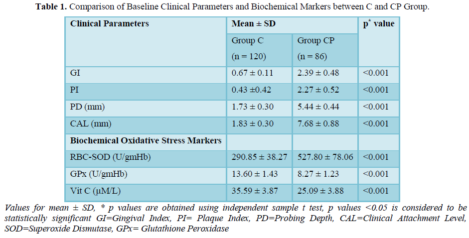 Scaling and root planning (SRP) is the phase I periodontal therapy and has been employed in controlling CP [6]. This therapy has yielded beneficial effect on clinical parameters like prolong depth (PD), clinical attachment level (CAL) [6], and healthy outcomes in the levels of biochemical markers like; 1L-1β, TNF-α, hsCRP, E-selectin etc. [7,8]. The bidirectional relationship between CP and OS is established [9]. The CP affects the OS status in the individuals and controlling the CP through the application of SRP has beneficial outcomes in OS markers [10,11]. Therefore, the present study was planned to quantify the association of the extent of improvement in clinical parameters to those of some systemic AO markers.