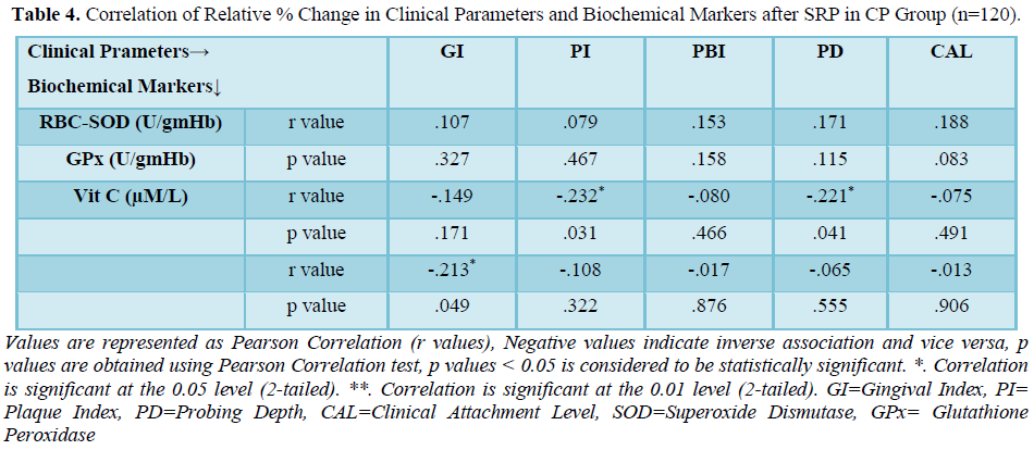 Results: Individuals with chronic periodontitis showed altered clinical and biochemical OS markers. After SRP, both clinical and biochemical parameters showed significant (p˂0.05) differential improvements from their corresponding pre-treatment values. When the relative percentage was assessed, the improvements in clinical parameters were higher than that of biochemical parameters. Further the relative % change in clinical parameters showed weak correlation to that of biochemical parameters.