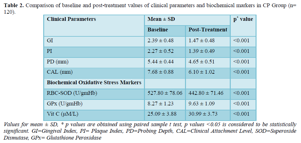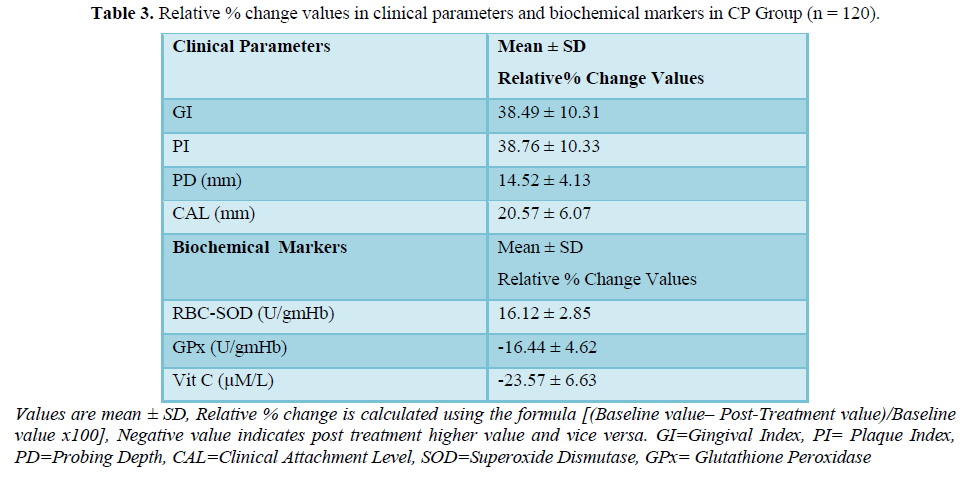 Furthermore, the results (Table 2) showed a statistically significant difference (p < 0.001) in the post treatment mean values of clinical and biochemical parameters compared to their corresponding baseline (pre-treatment) values for individuals of CP group. Table 3 represents the mean relative % change in the clinical and biochemical parameters in CP group. Among the biochemical markers GPx and vitamin C showed significant (p˂0.05) negative correlation to PI, PD and GI respectively (Table 4).