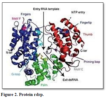 Structure (Figure 3): Viral/prokaryotic RNA-directed RNA polymerases, participant with many single- subunit DNA-directed polymerases, work a ply whose organization has been likened to the shape of a right hand with three subdomains termed fingers, palm, and thumb [29]. Only the palm subdomain, composed of a four-stranded antiparallel beta sheet with two alpha helices, is well keeped among all of these enzymes. In RdRP, the palm sub domain comprises three well-keeped motifs (A, B, and C). Motif A (D-x(4,5)-D) and motif C (GDD) are spatially juxtaposed; the aspartic acid residues of these motifs are implied in the binding of Mg2+ and/or Mn2+. The asparagine residue of motif B is involved in selection of ribonucleoside triphosphates over dNTPs [30].