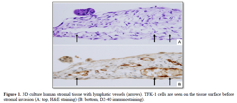 In conclusion, we demonstrate morphological characteristics of lymphatic invasion of the extrahepatic bile duct cancer, using 3D human stromal tissues with lymphatic vessels. The 3D tissues with lymphatic vessels are thought to become a useful model analyzing the lymphatic invasion mechanisms.