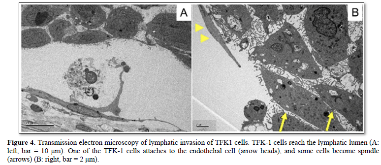 Transmission electron microscopy of lymphatic invasion showed TFK-1 cells attaching the endothelial cells, and becoming spindle in shape, i.e., EMT morphologically (Figure 4).