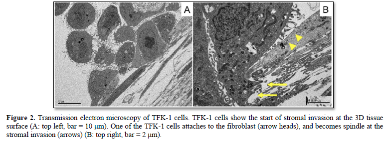 TFK-1 cells with many microvilli showed stromal invasion on the 3D stromal tissue at 24 h after seeding (Figure 2). Some of the TFK-1 cells attached to the fibroblasts, and changed morphologically. The TFK-1 cell became spindle in shape, and inserted its cellular part into the gap of fibroblasts, i.e., epithelial mesenchymal transition (EMT) at the start of stromal invasion.