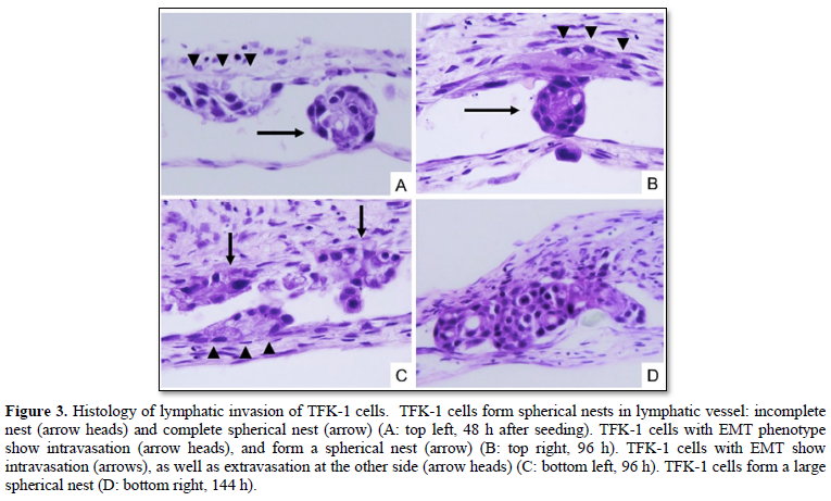 TFK-1 cells frequently showed lymphatic invasion at 48, 96, 144 h after seeding. TFK-1 cells morphologically became spindle in shape, i.e., EMT when they entered the lymphatic vessels (intravasation). Then, the TFK-1 cells formed spherical nests in the lymphatic vessels (Figures 3A & 3B). The TFK-1 reached the other side of lympho-vascular wall (extravasation), and also showed EMT morphologically at 96 and 144 h after seeding (Figure 3C). Some of the spherical nests in the lymphatic vessels became large in size, mimicking a tumor thrombus (Figure 3D).