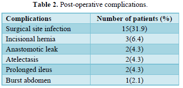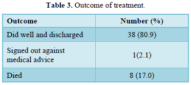 Most of the patients recovered and were discharged home. Eight (17%) mortalities were recorded and resulted from overwhelming sepsis. Detailed are depicted in (Table 3).