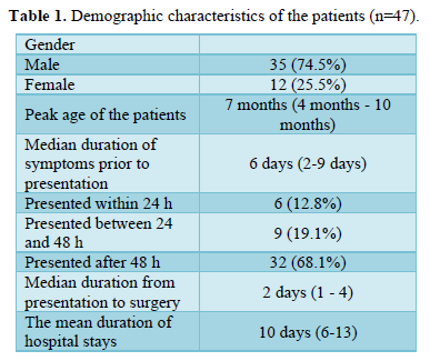 A total of 71 cases of intussusceptions were managed during the study period. Out of this number, 47 (66.2%) patients had laparotomy for the treatment of the intussusception and formed the basis of this report. The remaining 24 (33.8%) patients were treated by hydrostatic reduction. Details of the demographics are shown in (Table 1).