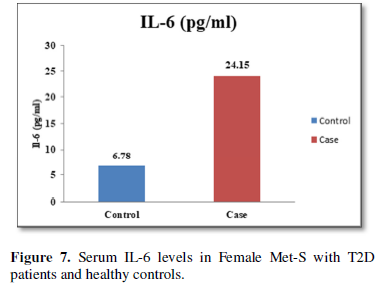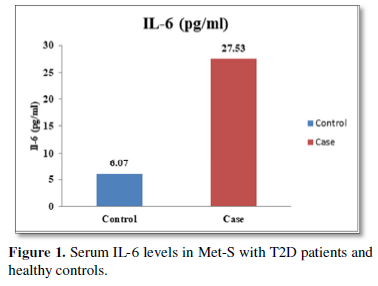 Moreover, recent study Mojgan [47] reported that serum IL-6 and TNF-α levels were significantly greater in metabolic syndrome patients with type 2 diabetes than in controls, supporting the evidence that inflammation plays an important role in the immune-pathogenesis of the disease. However, no correlation was found between Met-S components and IL-6 or TNF-α serum level. Rehman and Victoria [48,49] studies were observed similarly serum IL-6 were significantly higher in the diabetic patients than in the related controls. These all studies supported by our study results and these data support a possible role for inflammation in diabetogenesis. Thus, our results have confirmed these findings in metabolic syndrome patients with type 2 diabetes had significantly increased serum levels of IL-6 with other pro-inflammatory cytokines than healthy controls. These results support the evidence that inflammation plays an important role in the immune-pathogenesis of the disease. Additionally, we suggest that IL-6 and other pro-inflammatory cytokines serum levels be measured as valuable predicting factors for Met-S.